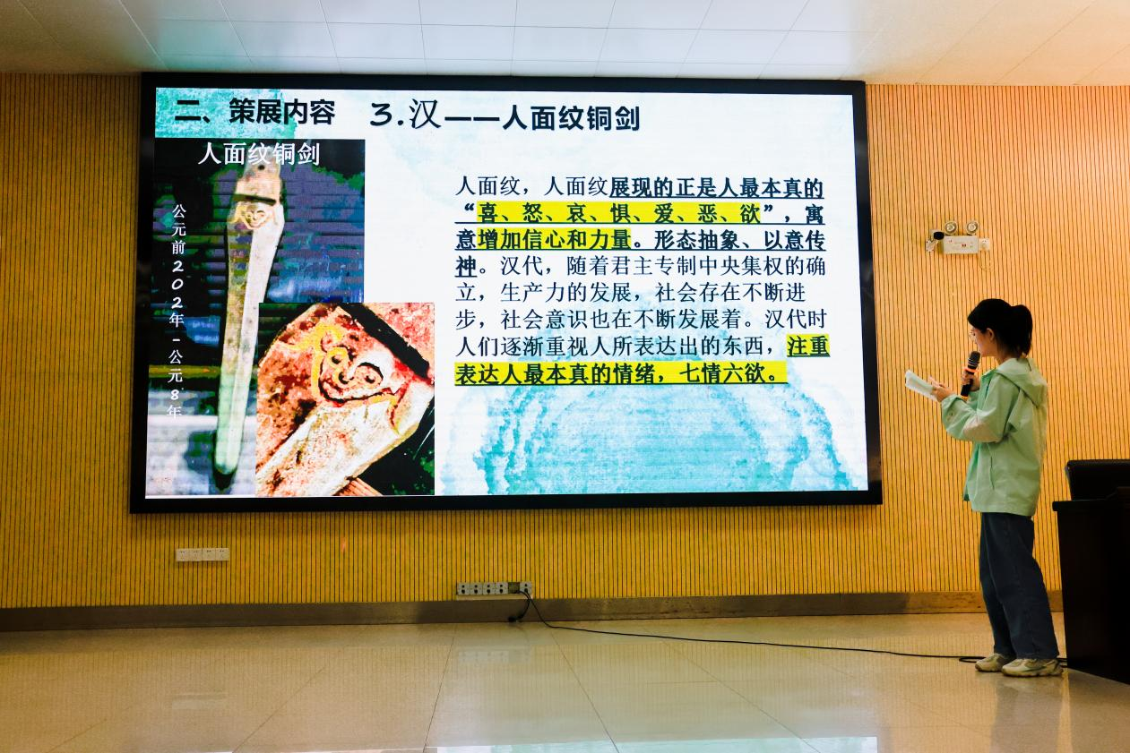 2204班的张惠婷同学带来了题为“发现青铜器花纹之美——中华文明青铜器花纹中蕴含的社会意识”的展览。她精心挑选了柳州市博物馆馆藏的云纹铜甬钟、云雷纹青铜角、变形蝉纹甬钟、以及人面纹铜剑等文物,通过这些青铜器上的花纹变化,揭示了古代社会意识的丰富内涵。 云雷纹的运用不仅象征着连绵不断与生生不息,也反映了古人对天空和天象的敬畏,以及对自然界力量的崇拜。随着社会生产力的逐步发展,人们开始更加关注生命本身,青铜器花纹中逐渐融入对人类最本真情绪的表达。从崇拜自然到关注人本身的转变,体现了‘社会存在决定社会意识’的唯物史观原理,展现了社会意识随社会存在变化而演进的历史脉络。