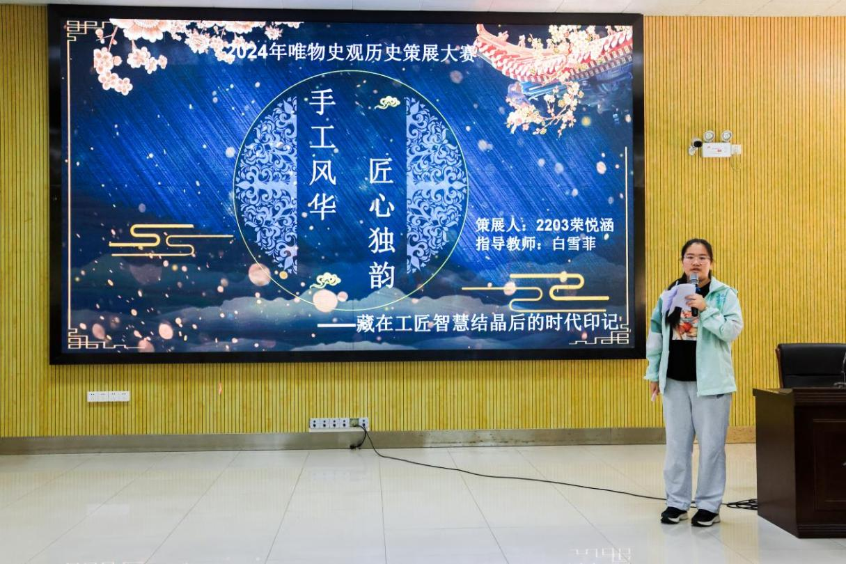 2203班荣悦涵同学以“手工风华匠心独韵——藏在工匠智慧结晶后的时代印记”为主题, 分别介绍了西周云雷纹青铜角、汉代弦纹灰陶瓠罐、宋代堆塑魂瓶、明代饕餮纹兽头环耳壶、清代青花白梅纹瓷罐五件手工业品。她从“社会存在决定社会意识”的角度,说明了中国古代各时期的手工业制品,都真实地反映了当时的社会生产力和人们的生活状态。接着她进一步阐释了生产力与生产关系、经济基础与上层建筑之间的关系,指出从西周到清朝,手工业制品的不断进步,是社会从奴隶制到封建制生产力发展的直接体现。此外,她认为那些默默无闻的古代工匠,用他们无与伦比的智慧和辛劳,创造了古代中国手工业的辉煌,充分体现了人民群众是推动历史发展的主体。
