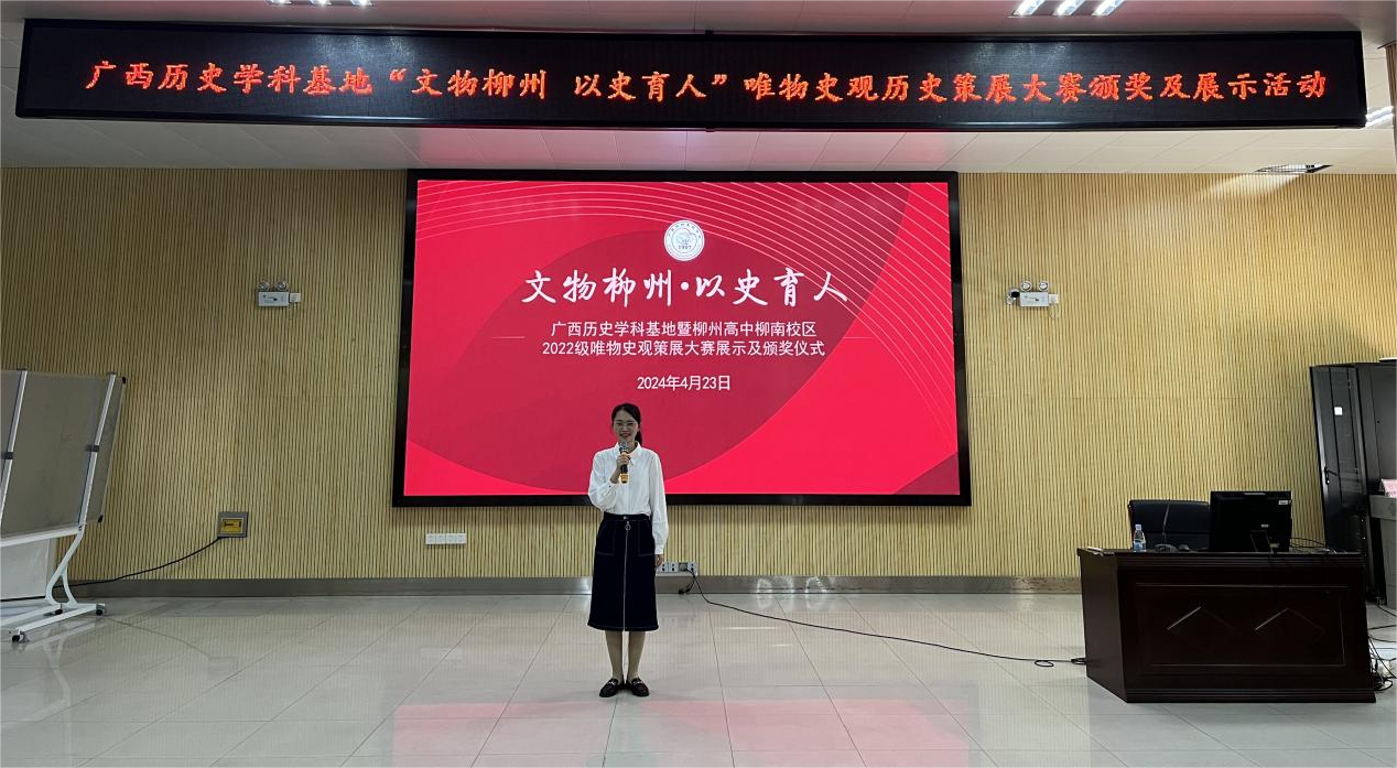 柳州是一所具有深厚文化历史底蕴的城市,各种各样的博物馆书写、记载了柳州历史。唯物史观是揭露人类历史社会客观基础及发展规律的科学的历史观和方法论,是高中历史学科五大核心素养中的统领。为将学科素养融入课堂内外,提升同学们对唯物史观的认识和理解,拓展历史学习的眼界与格局,柳州高中柳南校区高二年级历史组依托广西历史学科基地,开展了以“文物柳州·以史育人”为主题的唯物史观策展大赛。