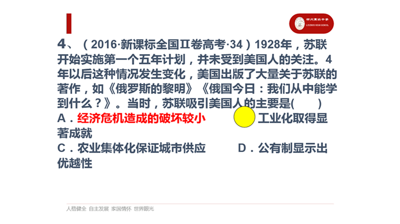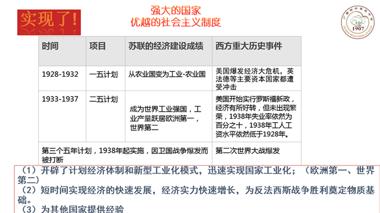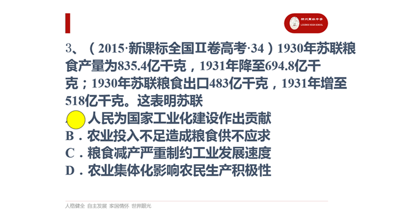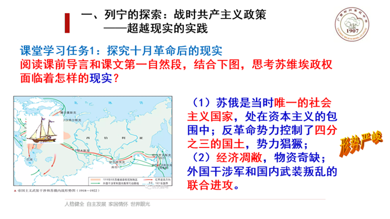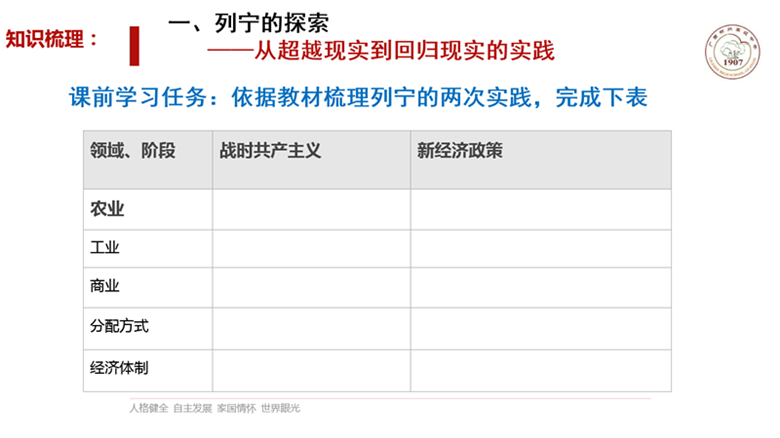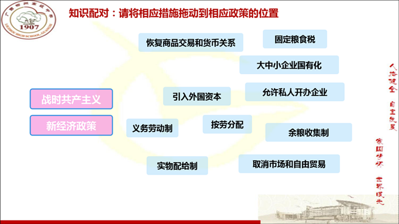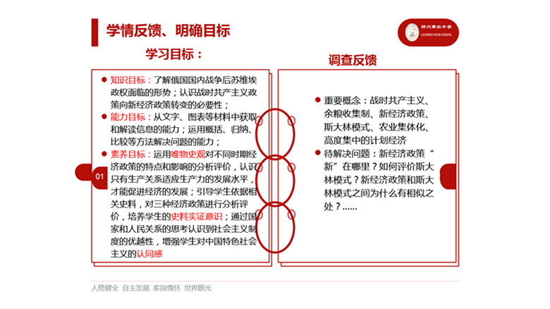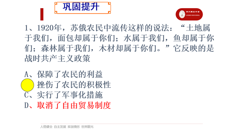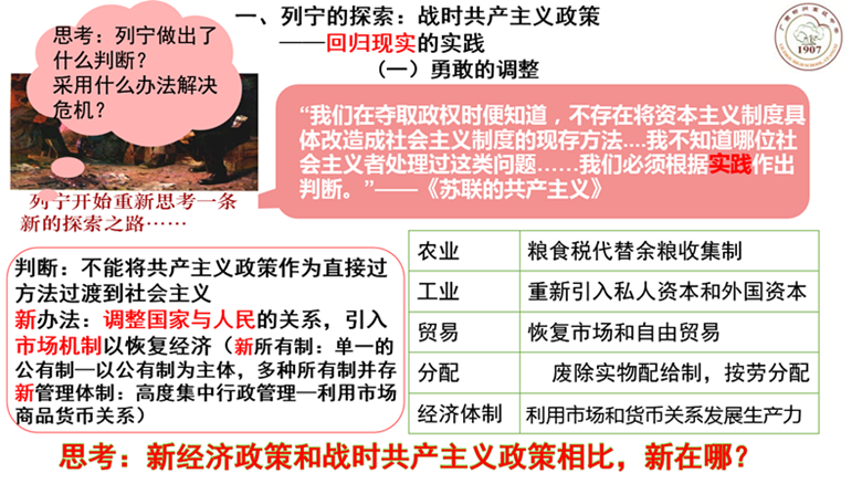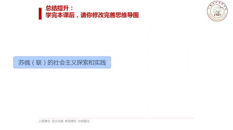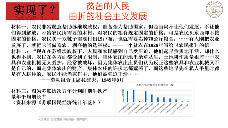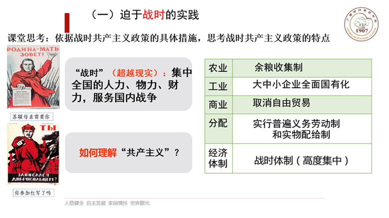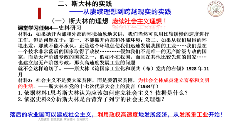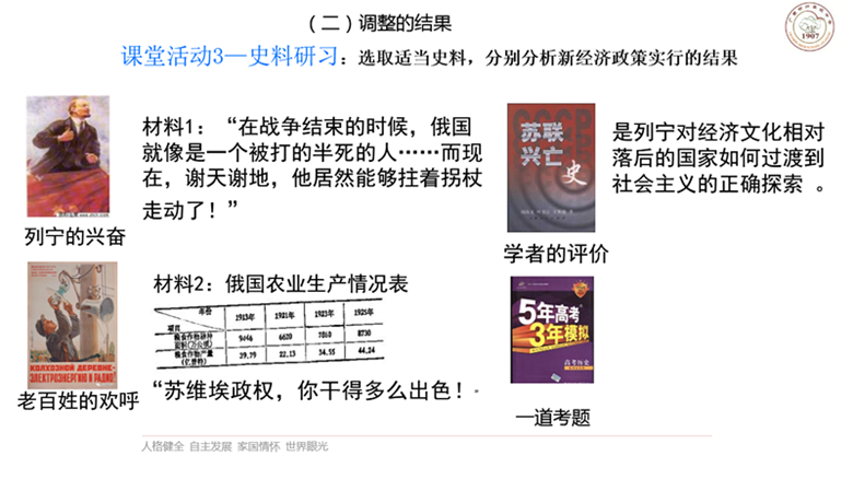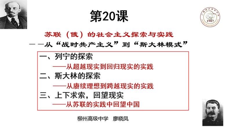 廖晓凤老师执教的内容为必修二第20课《从“战时共产主义”到“斯大林模式”》。廖老师从30年前苏联解体说起,呈现了一节对昔日红色苏联何以至此的反思型历史课。廖老师聚焦早期苏俄(联)领导人的实践,探究其共产主义理想与实践之间的路径,精彩诠释了苏俄(联)时代早期先行者们对于国家与人民之间关系协调的探索。整堂课紧凑、流畅,层层递进、环环相扣,既回忆了红色苏联奋斗历程,又升华至对当前我国社会主义现代化建设的启示,凸显了新课改要求下的家国情怀。