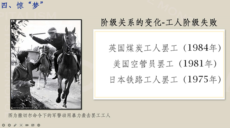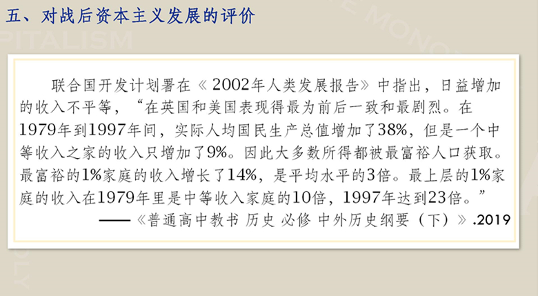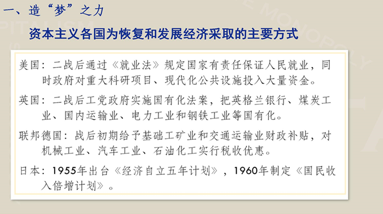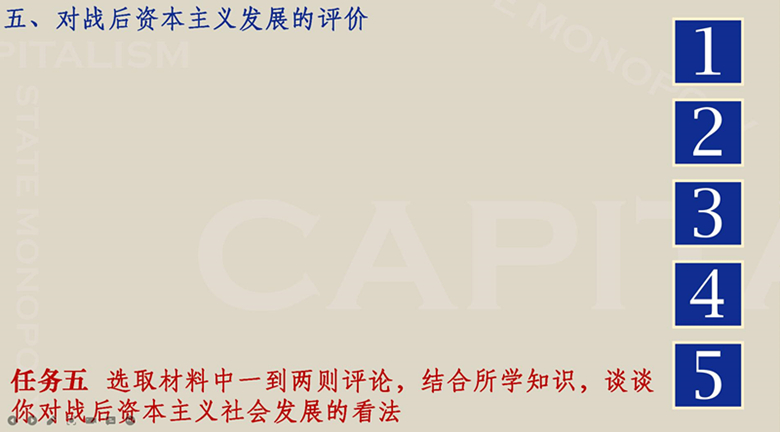 黄一聪老师执教的内容为必修二第19课《战后资本主义的新变化》。黄老师从本土特色企业——上汽通用五菱引入本课,以点串线,使学生身临其境地感叹全球化之近、中外交融之密切,凸显了新课改对乡土史在历史课堂的渗透理念。黄老师以主要资本主义国家二战后“造梦”为主线,将主要资本主义新变化融会贯通于“梦之基”、“梦之力”、“梦之效”之中。整节课娓娓道来、有条不紊,学界新观点、新认识游刃有余地渗透其中,凸显黄老师坚实的学术功底与领先视野,历史观上不偏不倚、一碗水端平,既肯定主要资本主义国家新变化带来的新面貌,也带领学生寻踪觅源地分析出资本主义制度发展的实质并没有改变,充分坚持了史学研究应抱有的客观、公正立场,进一步坚定了学生走社会主义道路的政治觉悟,强化了道路自信。